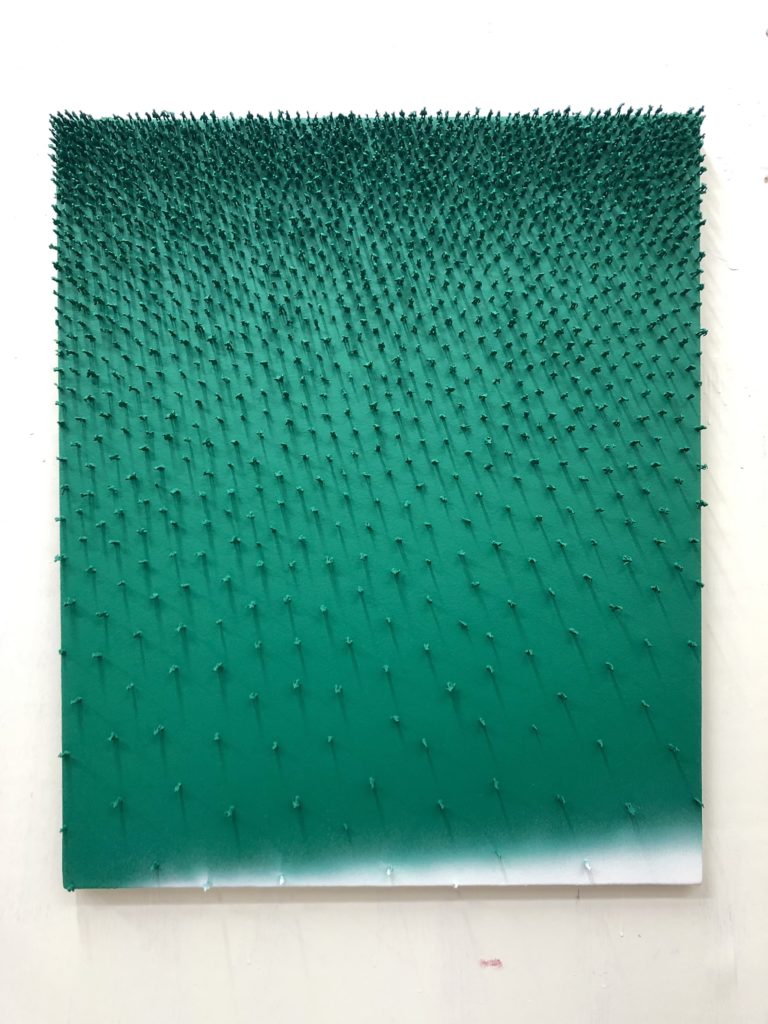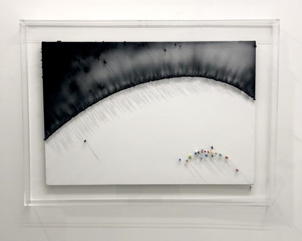 1/100サイズ(2cmほど)のプラスチック人形をキャンバスや既存の立体物に大量に立たせることで人の集団を表す。集団は社会を形作ることから、群衆心理、環境、ジェンダー、紛争、ネット社会などといった人間社会のことや、人の個性や愛情や愚かしさといった人間そのものに思いを巡らすことができるのではないかと考えている。